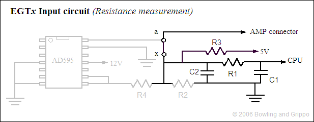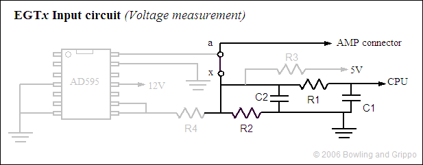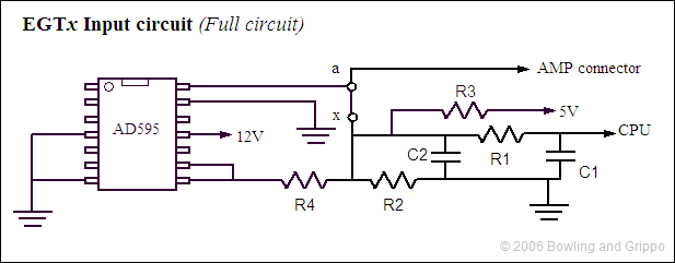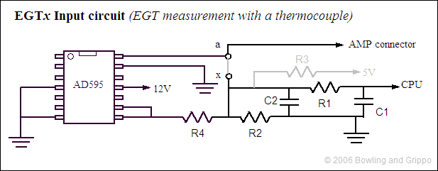 The EGT circuit by amplifying and correcting the small voltage output of a junction of dissimilar metals (called a "thermocouple") in the hot gas stream, creating a 0 to 5 Volt signal for the processor input port.